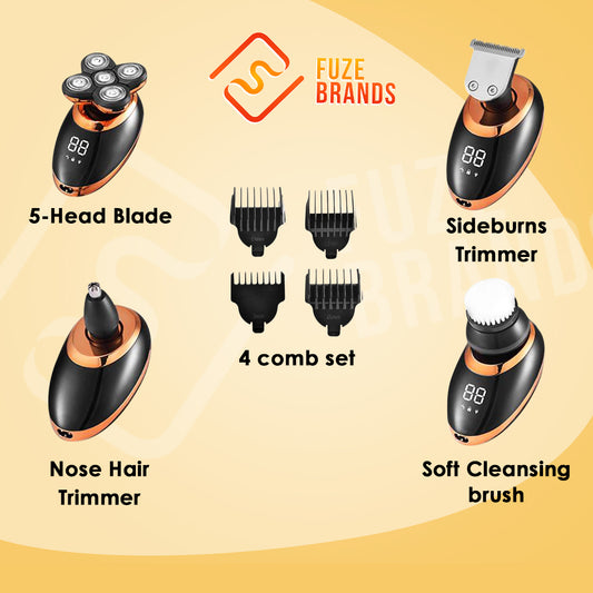 FuzeFlex 5‑in‑1 Head & Face Grooming Kit – 360° Flex Rotary Electric Razor, IPX6 Waterproof, Cordless Men’s Shaver